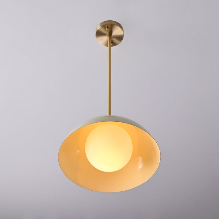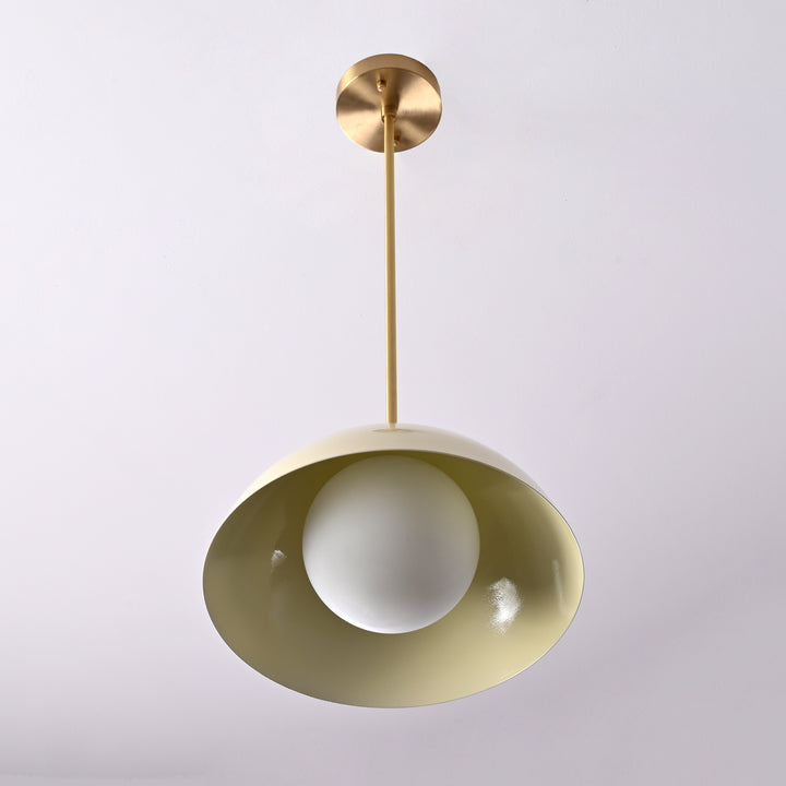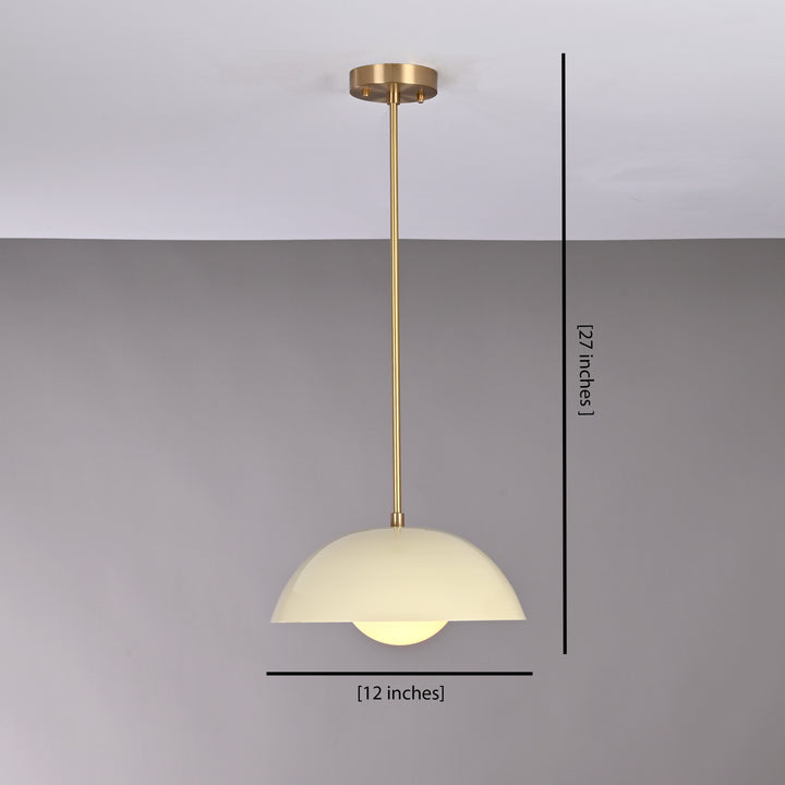 This modern pendant light features a sleek, minimalistic design with a semi-spherical shade that creates a striking visual presence from every angle. At the center, a smooth rounded diffuser is nestled within the shade, distributing light evenly for a soft and ambient glow. The internal globe enhances the overall light output, making it suitable for various settings such as dining areas, kitchens, or entryways. The pendant is supported by a streamlined brass rod structure that ensures a clean and stable suspension. With a diameter of 12 inches and a total height of 27 inches from ceiling to base, the fixture is well-proportioned for both single and grouped installations. Its sculptural form adds a touch of sophistication and modern elegance to any space.