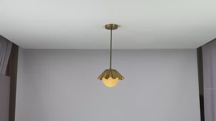 • This elegant pendant features a unique ruffled-edge brass shade paired with a round frosted globe bulb. Its sculptural form blends vintage charm with modern refinement, making it an eye-catching centerpiece for any room.