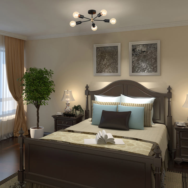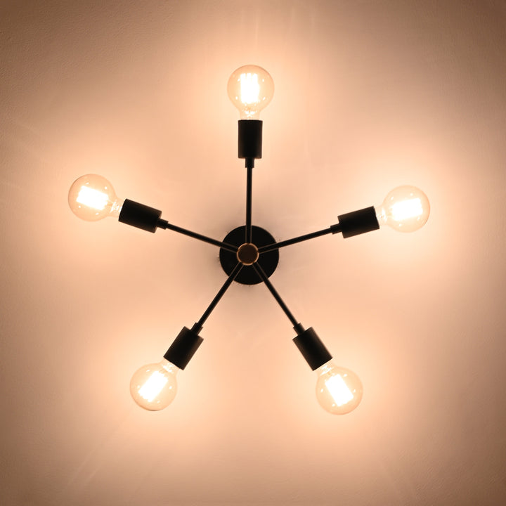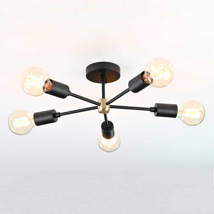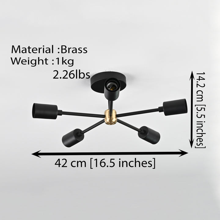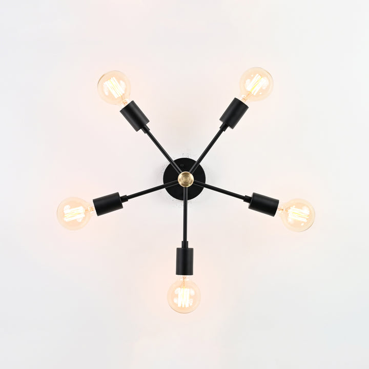 This modern ceiling light fixture features a sleek, black design accented with a central brass hub, offering a minimalist yet eye-catching look. The fixture is designed with five arms, each supporting a light, creating a starburst pattern ideal for contemporary interiors. With a diameter of 42 cm (16.5 inches) and a height of 14.2 cm (5.5 inches), it provides ample illumination while maintaining a compact profile perfect for rooms with standard ceiling heights.