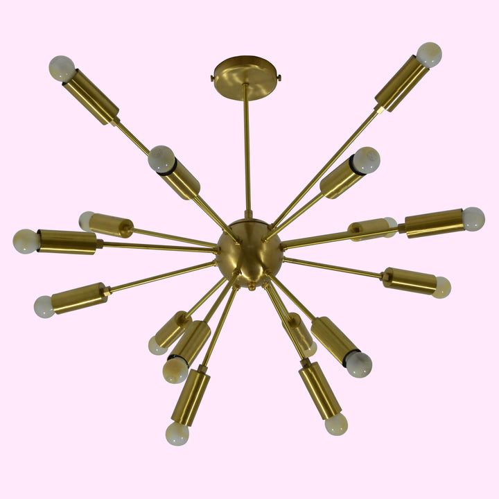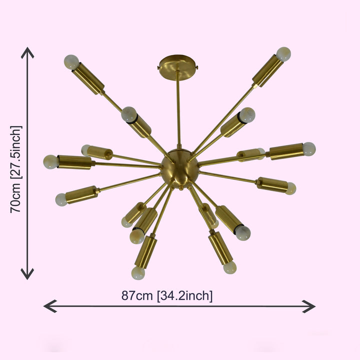 A radiant centerpiece with a striking modern twist, this chandelier redefines contemporary elegance. Designed with 16 slender, radiating arms, it evokes a mid-century starburst aesthetic while embracing a sleek, industrial edge. Each arm extends gracefully from a central brass sphere, ending in soft ambient glow. The lustrous brushed brass finish adds an opulent, golden touch that feels both timeless and fresh, making it a versatile statement in any space. Whether suspended above a dining table or illuminating a chic lounge, its symmetrical burst of light and form captivates with effortless flair. This fixture not only provides illumination—it creates atmosphere, exuding sophistication and warmth in perfect harmony.