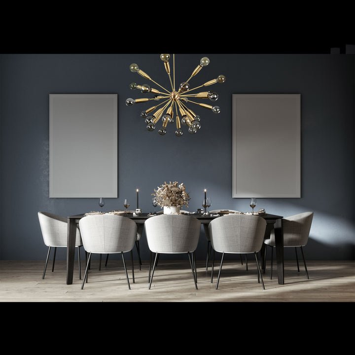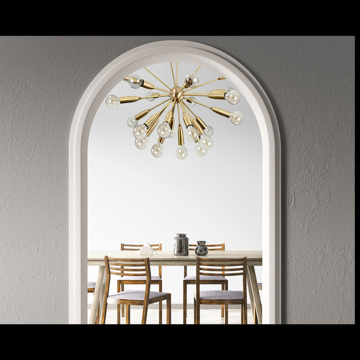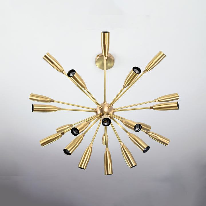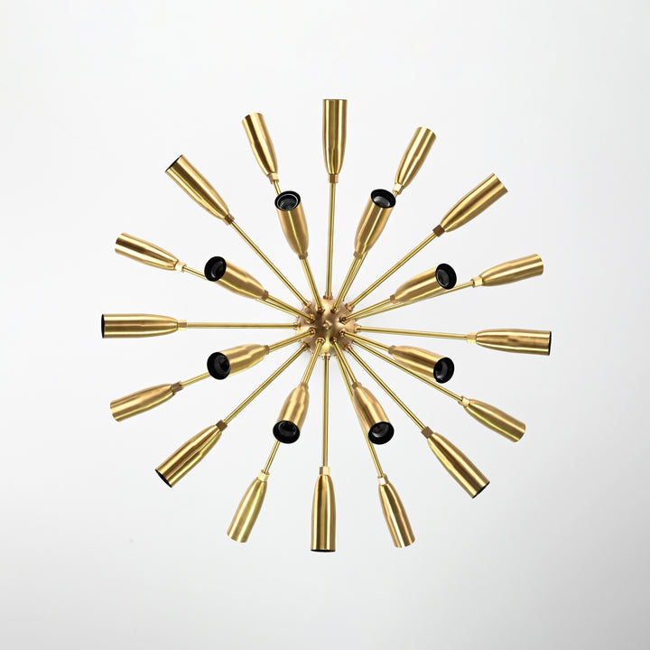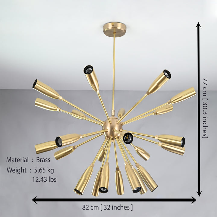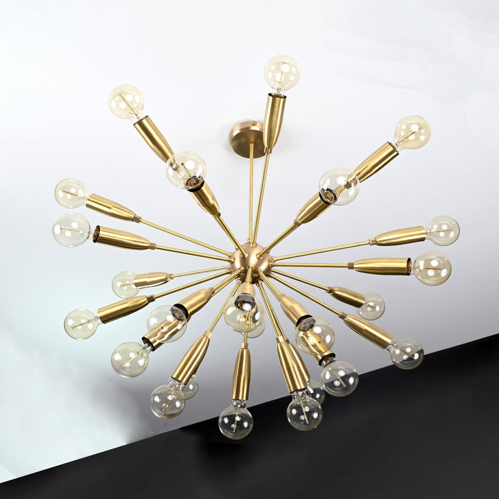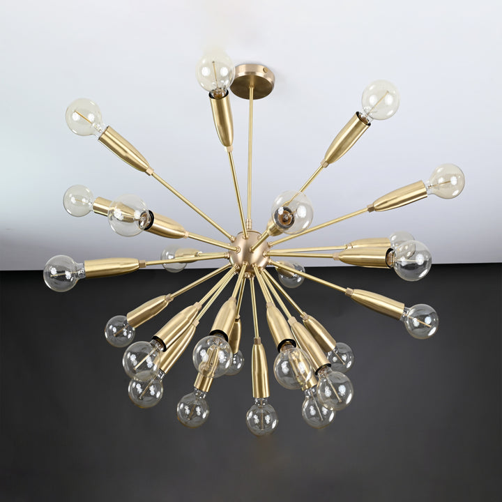 Embrace mid-century elegance with this striking brass sputnik starburst chandelier. Crafted in an iconic starburst design, its 24 radiating lights evoke a sense of modern sophistication and classic style. Measuring 32 inches in width and 30 inches in height, it serves as a spectacular centerpiece perfect for living spaces, dining rooms, or entryways. The chandelier’s dynamic sputnik structure casts a warm and inviting illumination, and in darker rooms, the glowing starburst shape provides a dramatic, cozy atmosphere that elevates the space with captivating charm.