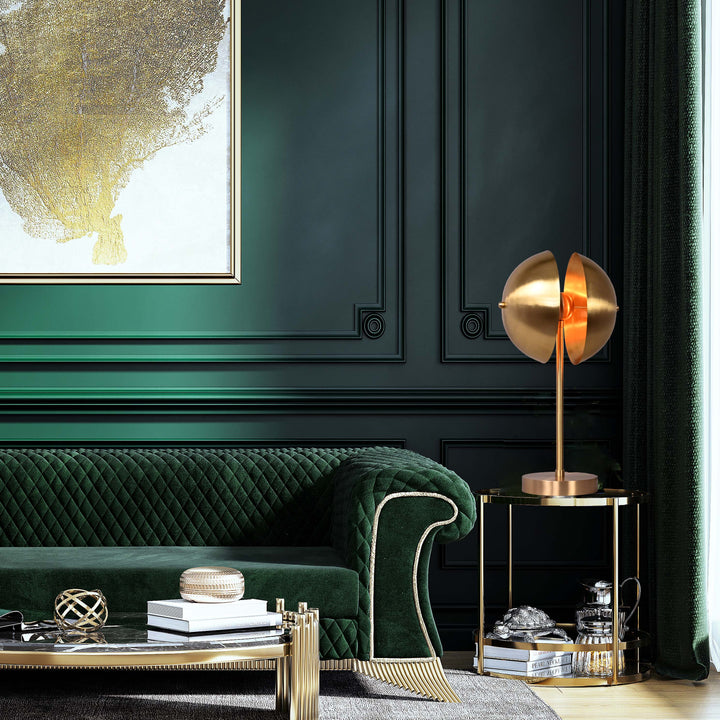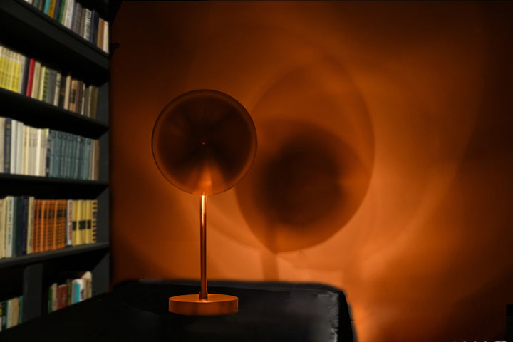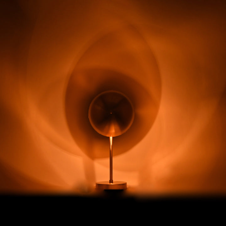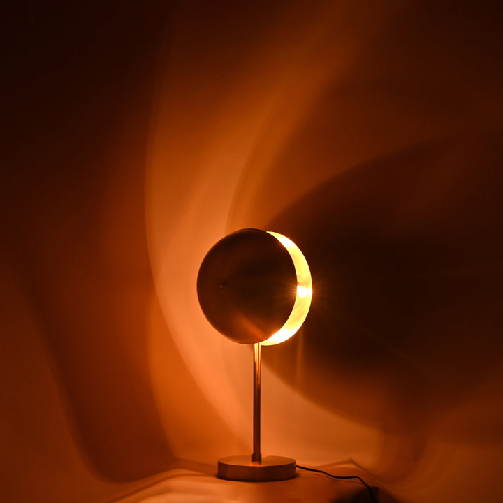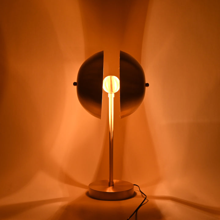 This uniquely designed table lamp features a sculptural structure with a total of 6 integrated bulbs cleverly positioned to create a stunning ambient effect. When illuminated in a dark room, the lamp casts mesmerizing, layered shadows and circular light patterns that enhance the space with a dramatic visual experience. The shell-like covers partially conceal the bulbs, allowing for creative light direction and intensity. With dimensions of 25 inches in height, 13 inches in width, and an 8-inch diameter base, the lamp makes a bold yet elegant statement. Its thoughtful construction provides both aesthetic appeal and functional lighting.