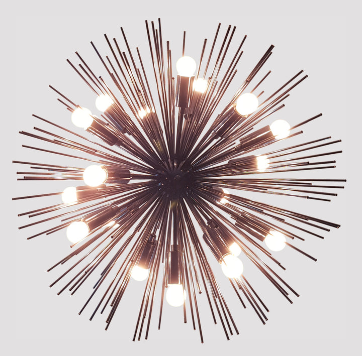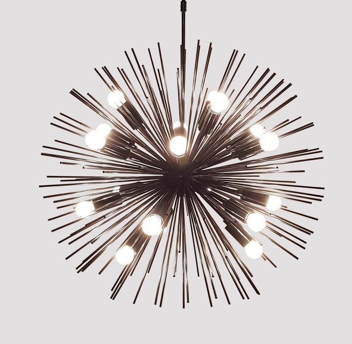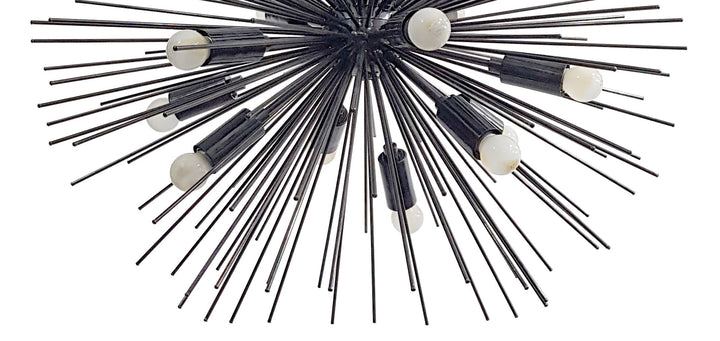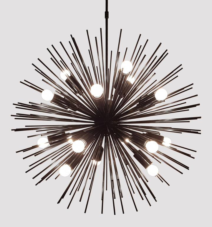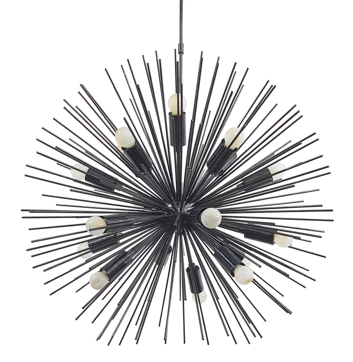 Make a bold statement with this striking urchin-style chandelier, a perfect fusion of modern art and functional lighting. Inspired by the natural form of a sea urchin, this dramatic fixture features an explosion of slender black rods radiating from a central core, creating a captivating, spiky silhouette. Nestled throughout the design are 18 light bulbs, strategically placed to emit a warm, ambient glow that enhances the sculptural presence of the piece. Ideal for contemporary or eclectic interiors, this chandelier is both an eye-catching centerpiece and a conversation starter.