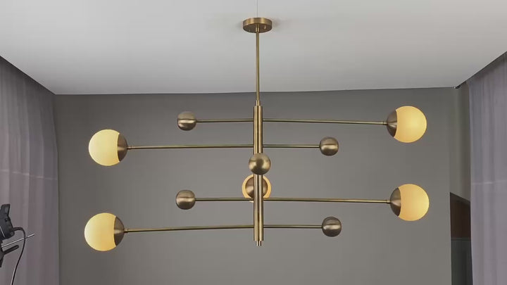 Bring timeless elegance and artistic charm into your space with Mid-Century Modern Brass Chandelier. Designed with five perfectly balanced arms and frosted glass globes, this statement piece fuses industrial design with contemporary minimalism to create a lighting solution that’s both bold and refined.