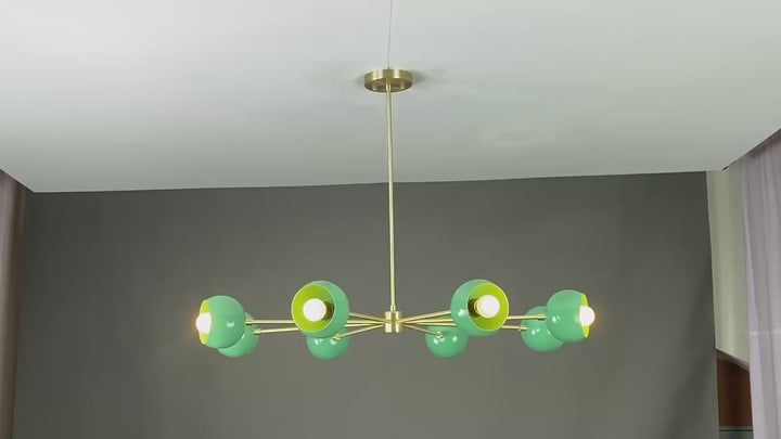Designed by Brass Leaf Studio, this 8-light chandelier blends modern minimalism with industrial elegance. Featuring smooth bowl-shaped mint green shades on a sleek brushed brass frame, it's ideal for homes and boutique spaces seeking a bold statement piece.