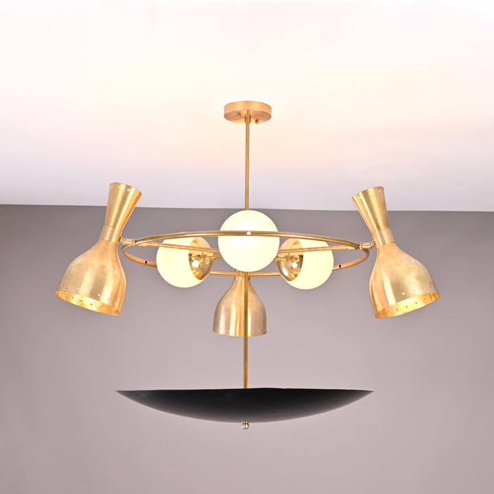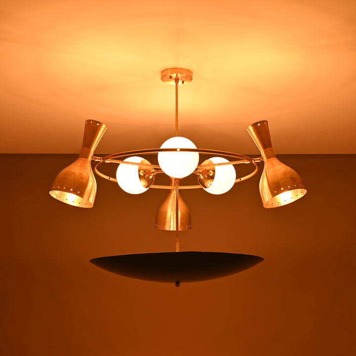 This striking chandelier features a meticulously crafted structure comprising three diabolo shades and three opal glass globes, encircling a central rod with a floating disc element below. It is designed with a total of 14 bulbs to illuminate the room. The chandelier measures approximately 30 inches in width and 32 inches in height, giving it an impressive yet balanced presence. When lit in a dark room, the fixture creates a warm, ambient glow that beautifully highlights its elegant forms and adds depth to the surrounding space. Its design is a blend of functional brilliance and sculptural artistry, ideal for creating a sophisticated atmosphere.