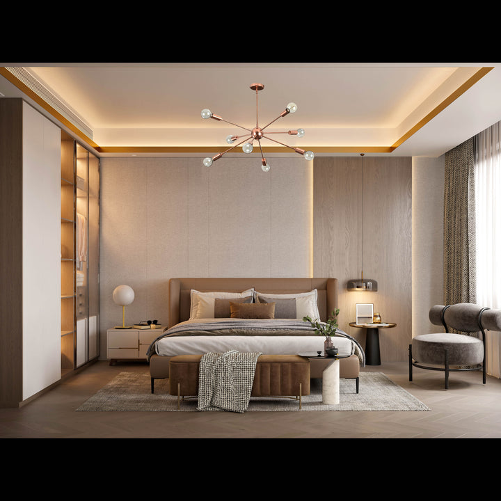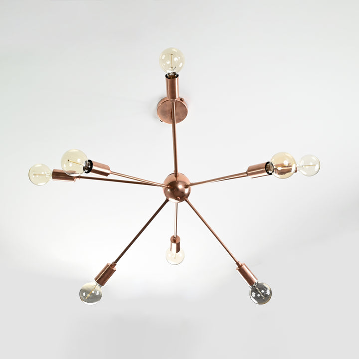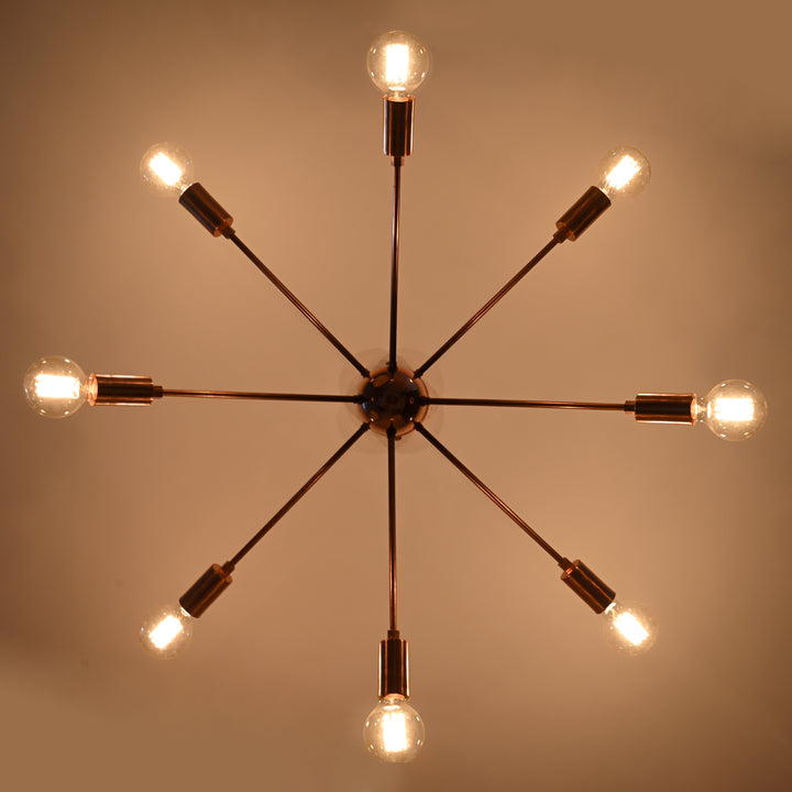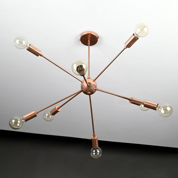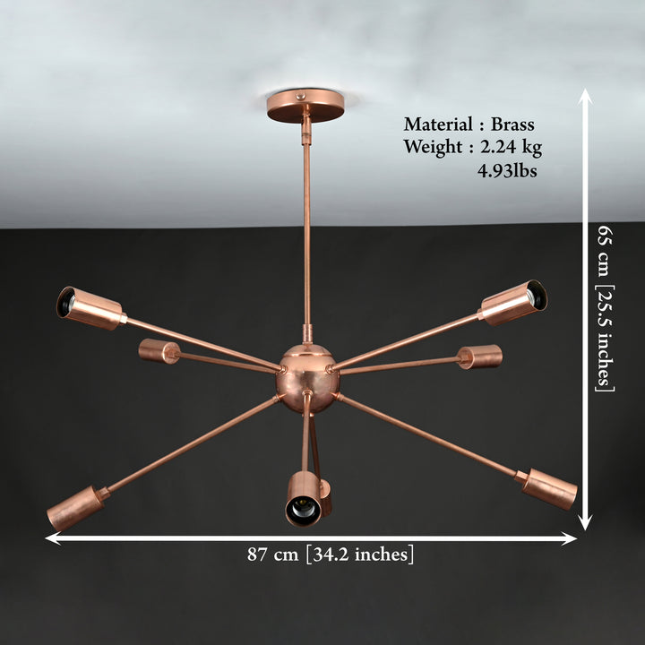 Elevate your space with this stunning Sputnik-style chandelier, a true statement piece crafted from high-quality brass. Measuring 87 cm (34.2 inches) in width and 65 cm (25.5 inches) in height, this bold fixture features 8 radiating arms, each supporting a light, creating a striking starburst design that blends modern elegance with a mid-century vibe. Whether viewed from below or the side, the design adds architectural intrigue and balance. Its copper antique finish enhances both contemporary and vintage-inspired interiors. When lit, the chandelier casts a rich, ambient glow, especially impactful in darker rooms, highlighting the dramatic form and giving off an inviting warmth. This chandelier is both sturdy and easy to install—perfect for dining rooms, living areas, or entryways seeking a bold visual touch.