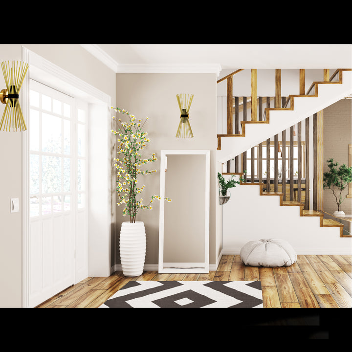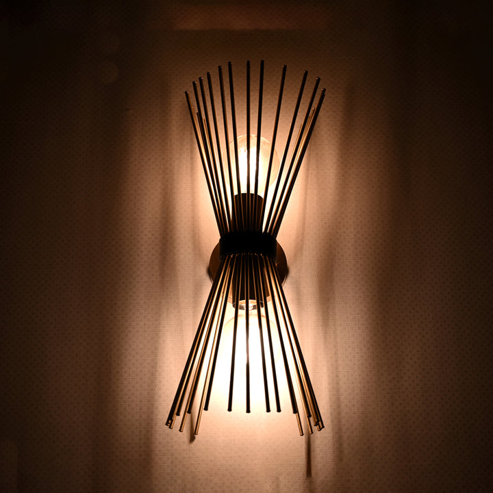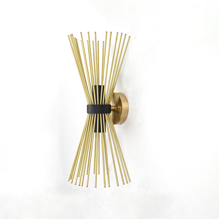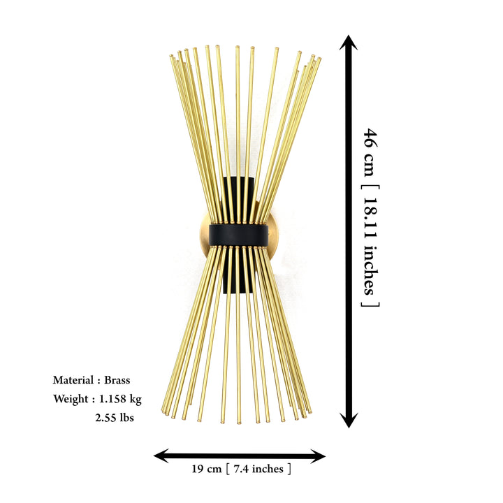 Make an unforgettable statement with this sculptural brass rod wall sconce, a true fusion of art and lighting. Standing 18.11 inches tall and 7.4 inches wide, this piece features dozens of slender brass rods arranged in an hourglass form, cinched at the center with a matte black accent. The dramatic, symmetrical structure adds movement, texture, and modern elegance to any wall, while casting ambient shadows and reflections that change throughout the day. Crafted from high-quality solid brass, this fixture is as durable as it is visually captivating. Whether placed in a hallway, living room, entryway, or high-style commercial space, it becomes an instant conversation piece. This sconce pairs beautifully with mid-century, Art Deco, or modern glam interiors—bringing a sense of rhythm and artistry to your decor.